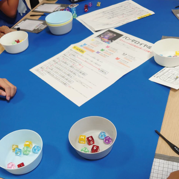 まだまだ小さい子には、6面ダイス、8面ダイス、12面ダイスの違いが分からず、同じ色のダイスでも6面ダイスを取ることも見られたのが、教え甲斐があるなーと思いつつ見ていました。