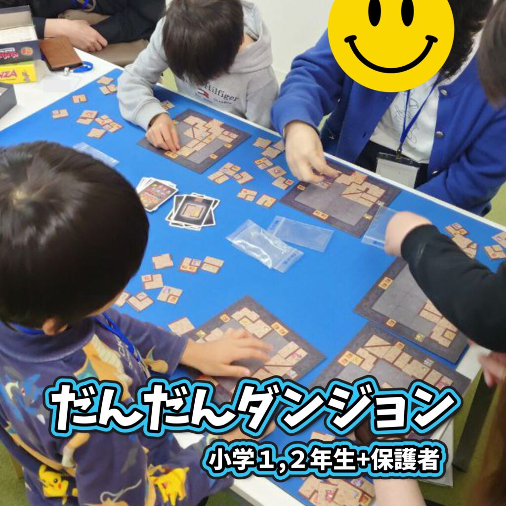 小学1、2年生と保護者がプレイしただんだんダンジョンは、一般発売前のゲームで、ただタイルを並べていくだけなのですが、全員が同じタイルを並べるので、同一条件で一斉にプレイするので、他の人の考え方が見えて面白いゲームです。